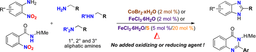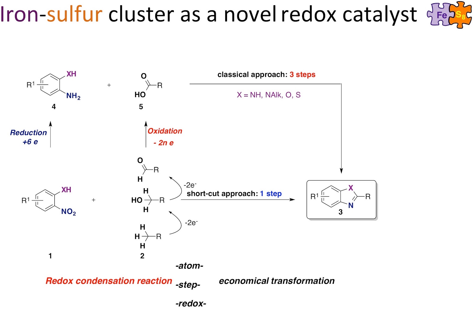 Abstract. A method to assemble 2-aminobenzoxazoles via iron-catalyzed redox condensation of amines, carbon disulfide and 2-nitrophenols is reported. The reaction features advantages of environmentally friendly iron catalyzed conditions, readily available starting materials, and excellent atom-, step- and redox- economy compared to known protocols. Experimental investigation suggests a mechanism encompassing iron-catalyzed reduction of the nitro group of 2-nitrophenols by the dithiocarbamate group from amine-CS2 adduct.