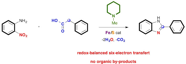 Abstract. As frequently encountered byproducts of isocyanate chemistry, hydrogen sulfide and related sulfur containing compounds should be treated in a safe way to lower their adverse health and environmental effects, especially in large scale syntheses. As a proof of concept, we report herein an example of in situ recycling of sulfur byproduct to reductant in the synthesis of bioactive 2-aminobenzoxazoles 3. Using an Fe/S catalytic system, this heterocyclic scaffold could be obtained from o-nitrophenols 1 with isothiocyates 2 via direct redox condensation consisting of reduction of the nitro group of 1 by the sulfur moiety of 2.