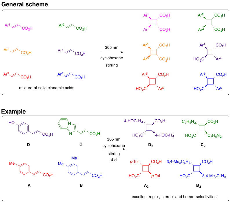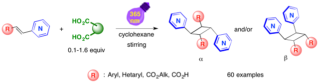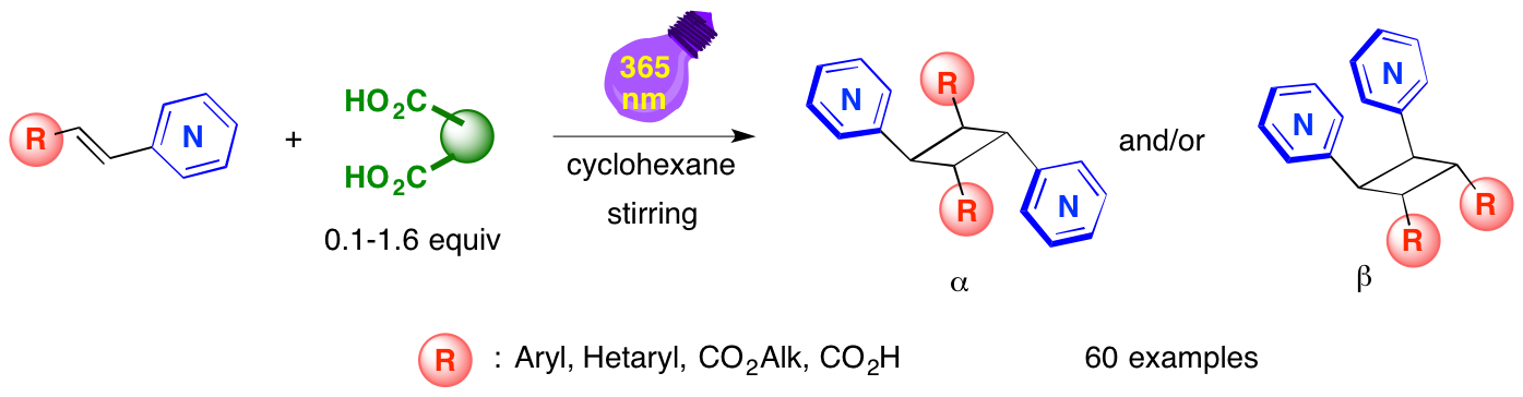 Abstract. In this study we reported on a very simple technique to perform efficiently photodimerization of some vinylpyridines. By irradiating a stirred mixture of several stilbazoles with solid oxalic acid dihydrate dispersed in a non‐polar (e. g. cyclohexane) or moderately polar (benzene, dichloromethane, dioxane) solvent, the corresponding dimeric cyclobutane adducts were obtained in high yields with excellent of regio‐ and stereo‐ selectivities. The strategy could also be applied successfully to oily, waxy or even insoluble stilbazoles. Moreover, the oxalic acid loading could be lowered to sub‐stoichiometric amounts. When further optimizations were needed, our strategy was found to be highly flexible to identify other oligocarboxylic acids as alternative additive to improve or even overturn regioselectivity. Oxalic acid and other oligocarboxylic acids were found to be capable of orienting more than fifty stilbazoles toward photodimerization under these conditions.