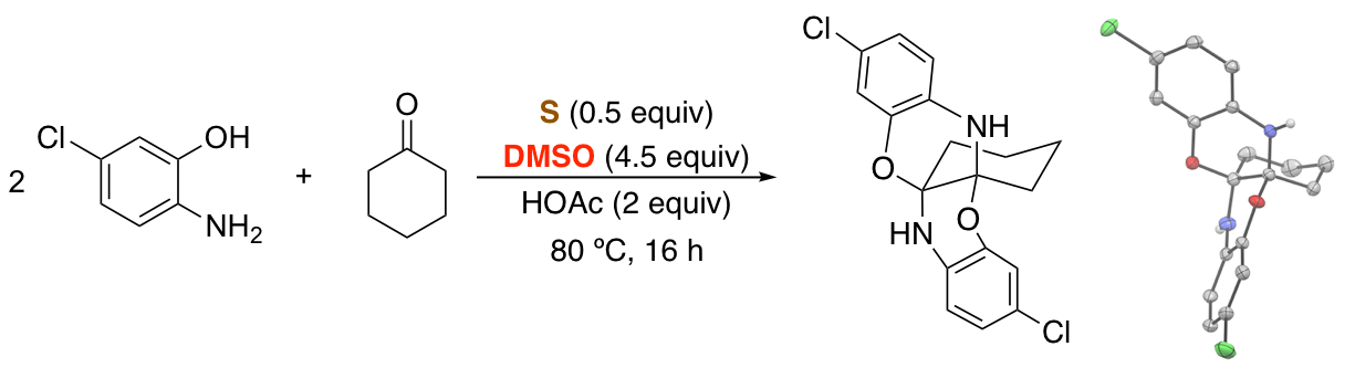Abstract. Sulfur was found to be an excellent catalyst for the oxidative coupling of cyclohexanones with o-aminophenols using DMSO as oxidant. A wide range of heteropropellanes were obtained with complete regio and stereoselectivities and functional group tolerance.