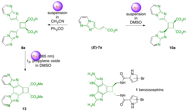 Abstract. By simply switching solvents, two sets of conditions for total regio- and stereo- selective photodimerization of (E)-3-(imidazo[1,2-a]pyrimidin-2-yl)acrylic acid (E)-7a were found. In acetonitrile in the presence of benzophenone as a photosensitizer or in cyclohexane, head-to-head cis-trans-cis isomer 8a was the only observable cycloadduct. In DMSO, head-to-head trans-trans-trans isomer 10a was obtained as the unique cycloadduct. The diester 9a was cyclized into the challenging fully substituted diimidazobenzobutane 13 system present in benzosceptrins.