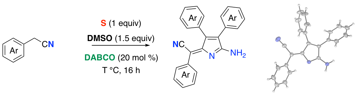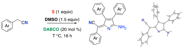 Abstract. By simply heating phenylacetonitriles 1 with elemental sulfur and DMSO in the presence of a catalytic amount of DABCO, we have performed an oxidative trimerization leading to polysubstituted pyrrole heterocycles 2 in excellent yields and E-configuration.