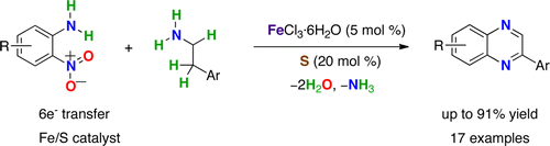Abstract. While elemental sulfur has been largely used as oxidant or sulfurating agent, its role as a catalyst has not been developed. We report here its catalytic activity in the oxidative condensation of o-phenylenediamines with acetophenones in DMSO to provide quinoxalines. The method was also extended to α-tetralones, propiophenones (R=Me) as well as higher homologues (R=Et, n-Pr) in place of acetophenones, leading to a wide range of naphthoquinoxalines and 3-substituted 2-arylquinoxalines.