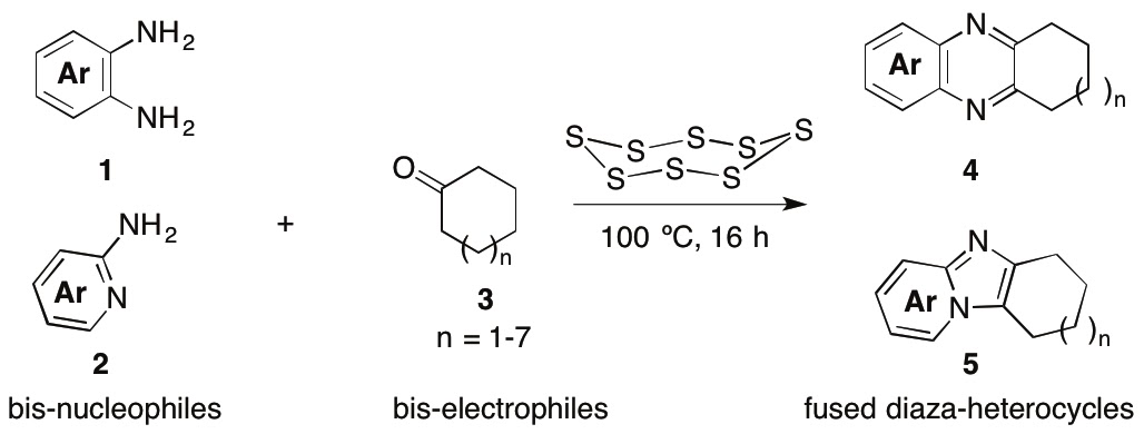 Abstract. The S8/DMSO combination was found to be an excellent oxidizing agent for ipso,α,β,γ-tetramination of cyclohexanones with two molecules of o-phenylenediamines in the presence of TFA as a catalyst. The strategy could be applied to pyrido cyclohexanes as a direct method to extend the fused heteroaromatic system.