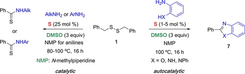 Abstract. In the presence of catalytic amounts of elemental sulfur, dibenzyl disulfide/DMSO was found to be an excellent thiobenzoylating agent of amines to provide a wide range of thioamides. The reaction becomes autocatalytic when anilines substituted by an o‐cyclizable group were used as nucleophile, leading to the corresponding 2‐aryl aza heterocycles.
