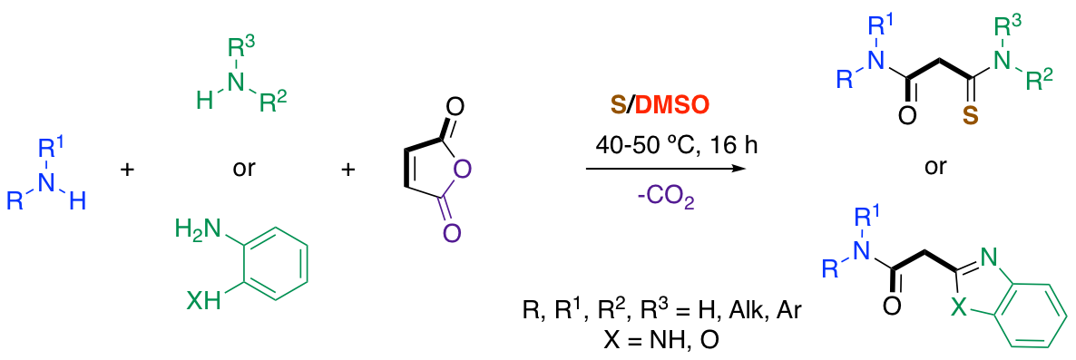 Abstract. Malonic acid derivatives could be conveniently prepared with high degree of functional flexibility via redox condensation reactions between anhydride maleic, amines, elemental sulfur and DMSO as oxidant. This multicomponent decarboxylative transformation consists in a cascade of ring opening, decarboxylative oxidative thioamidation at temperature as low as 50 °C.
